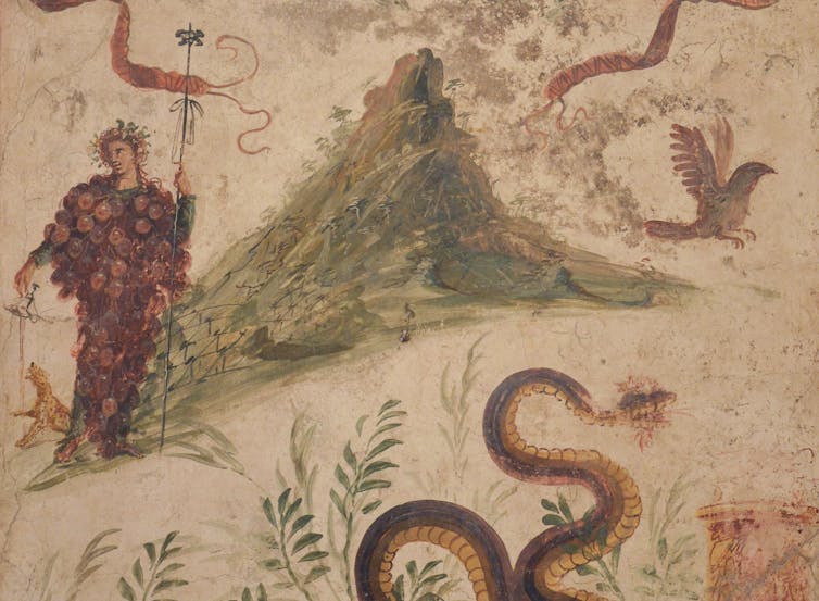 Cette fresque retrouvée à Pompéi, datée de 55 à 79 après J.-C., représente Bacchus couvert de raisins, le Vésuve et ses vignes en treillis en arrière-plan. Naples Archaeological Museum