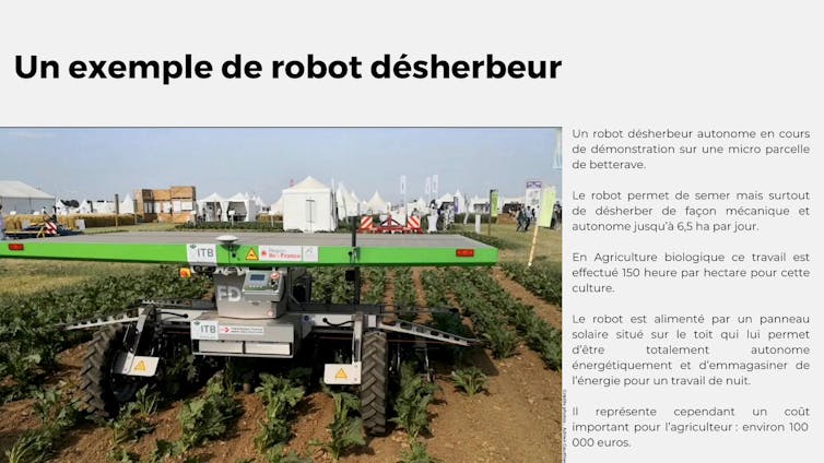 La robotique représente aussi un domaine en plein développement pour les productions végétales. Pour exemple, un robot de désherbage autonome est déjà utilisé en France en culture betteravière sur de petites surfaces. Il permet de semer mais surtout de désherber de façon mécanique jusqu’à 6,5 ha par jour, alimenté par un panneau solaire, permettant d’être totalement autonome énergétiquement.