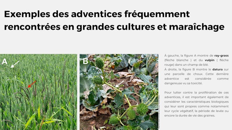 Mais l’utilisation répétée d’herbicides peut avoir un effet contre-productif : celui de conduire à la sélection et développement de résistances aux substances actives chez les plantes dont on cherche à se débarrasser. Un peu de la même façon qu’un antibiotique trop utilisé peut générer une antibiorésistance. Par exemple, deux espèces d’adventices dans les champs de céréales d’hiver, le ray-grass et le vulpin des champs, posent actuellement des difficultés de désherbage aux agriculteurs français, car elles sont envahissantes et difficiles à maîtriser avec les herbicides actuels (Figure A).