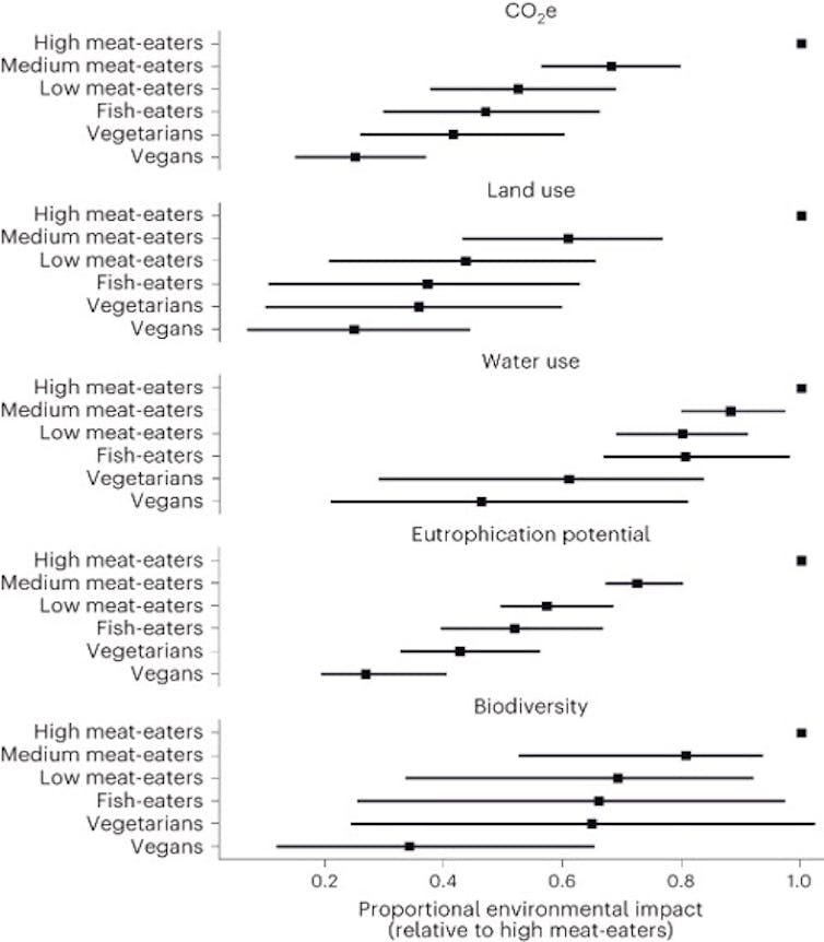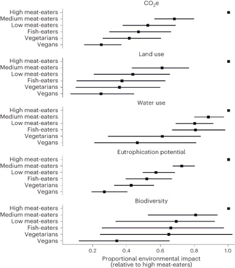 Enfin, les régimes méditerranéens, pescétariens et « frugal et juste (fair and frugal) », également assimilables à des régimes flexitariens, favorisent également une réduction modérée des émissions de gaz à effet de serre par rapport à une alimentation très carnée. Une alimentation remplaçant 75 % des viandes et produits laitiers de ruminants par d’autres viandes (catégorie « carnivore soucieux du climat (climate carnivore) ») permet d’atteindre des réductions d’un ordre de grandeur similaire, soulignant le poids exceptionnel de la viande rouge.