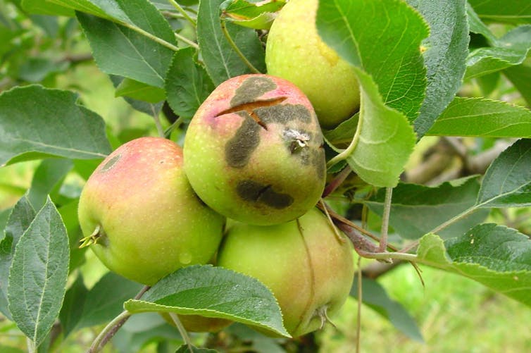 Un pommier malade va produire des pommes tachées. Les fruits tachés ne sont pas nocifs pour la santé humaine, mais ne peuvent être ni vendus ni exportés. C’est la raison pour laquelle les arboriculteurs utilisent des fongicides entre 15 et 20 fois par an, un chiffre qui peut grimper jusqu’à 40 traitements sur les variétés les plus sensibles lors de printemps particulièrement pluvieux. À titre de comparaison, les producteurs de blé appliquent au maximum trois traitements fongicides par an.