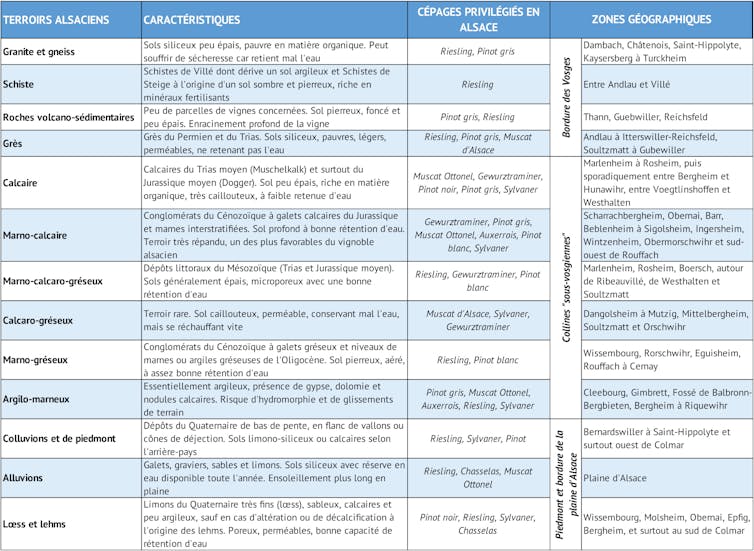 Les terroirs résultent d’un ensemble de caractéristiques (topographie, eau, sol, climat, savoir-faire vigneron, botanique, biologie, etc.) auxquelles la géologie concourt, à son échelle, à cet « écosystème ». L’expérience séculaire des vignerons a conduit à la production de vins mono-cépages (à l’exception de l’Edelzwicker et du Gentil) qui reconnaît la diversité des 13 terroirs alsaciens auxquels s’adapte chacun des cépages.