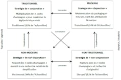 Sur la base de l’opposition entre tradition et modernité, nous avons pu identifier quatre stratégies principales d’innovation packaging en Champagne. Délibérément complexes, les packagings traditionnels multiplient les codes champagne afin d’attirer le consommateur, se substituant à toute action publicitaire ou promotionnelle. Affichant un degré de modernisation limité, les packagings patrimoniaux permettent de mieux communiquer sur la marque, tout en conservant de nombreux codes champagne.