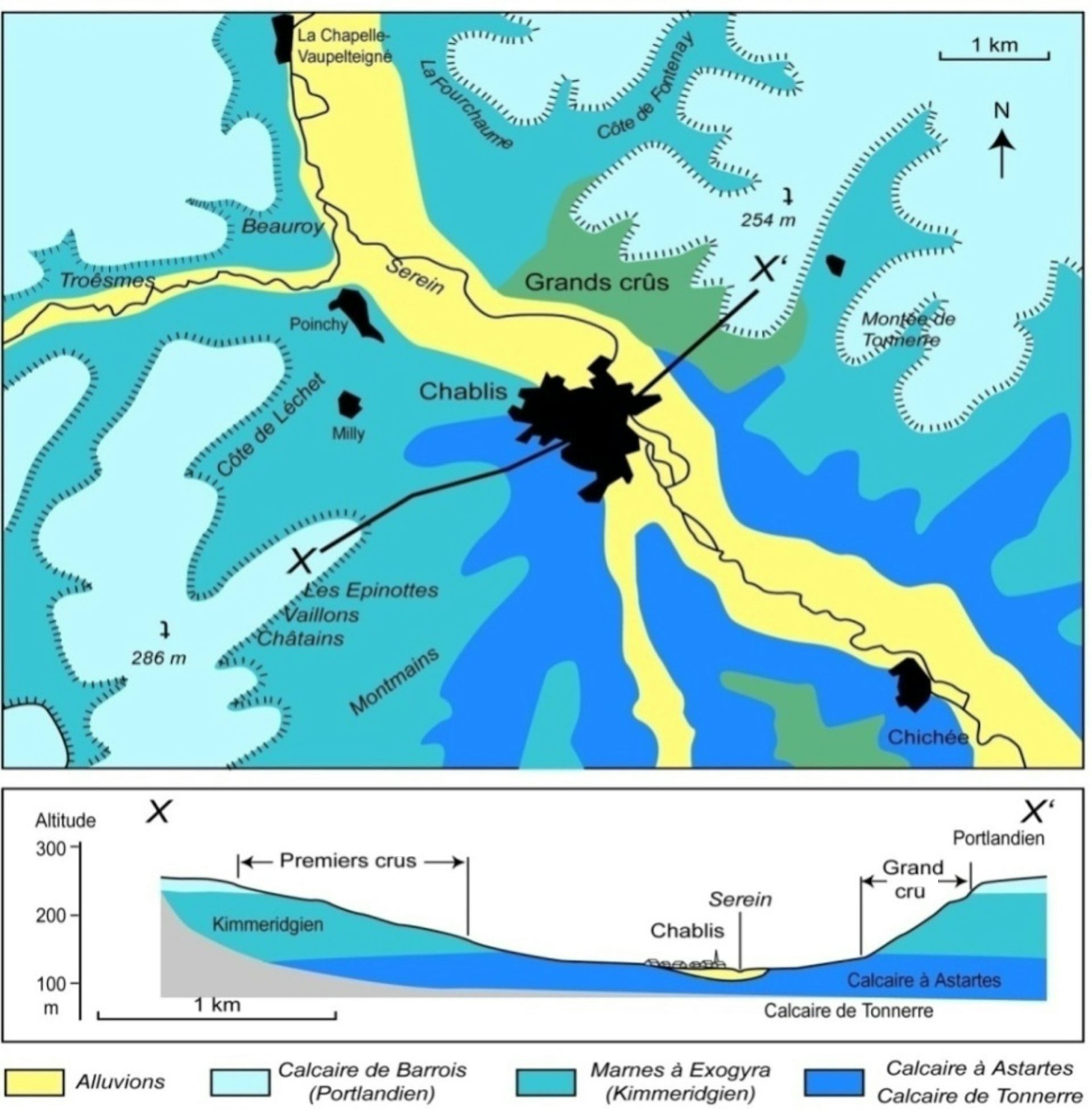 La carte montre que l’on retrouve les crus de Chablis sur les marnes du Kimméridgien (bleu vert). Les « grands crus », eux, se retrouvent sur les pentes les plus raides, dotées d’un ensoleillement plus important (étant tournées vers le sud-ouest) que les « premiers crus ».