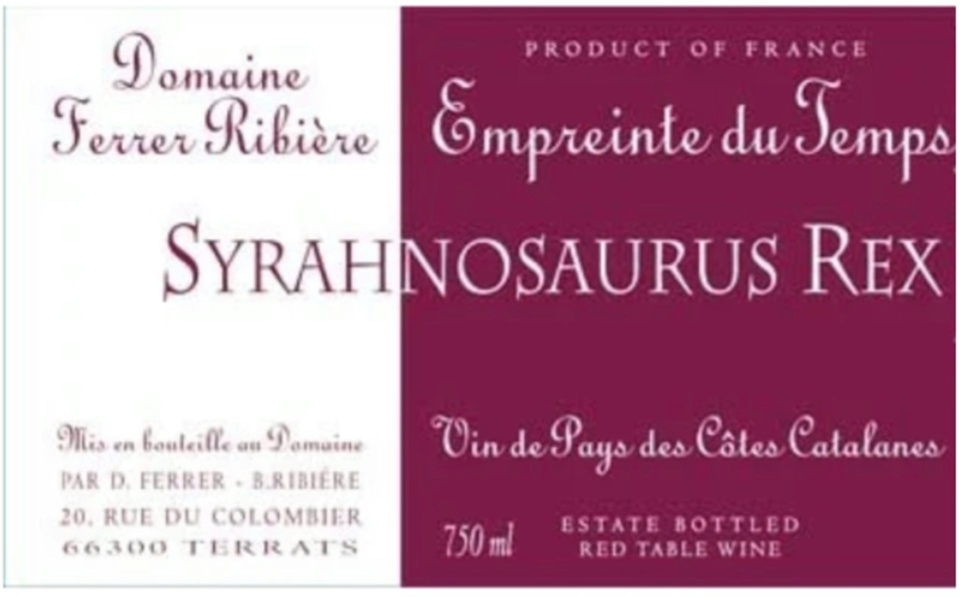 D’autres mentionnent des minéraux (Cuvée Aragonite pour un Mâcon), des roches (Amphibolite pour un Muscadet), ou des fossiles, comme Ampelomeryx pour un Côtes de Gascogne, Cuvée du Ptérosaure pour un Saint-Chinian ou encore « cuvée des dinosaures » pour une blanquette de Limoux. Mais celui qui m’a la plus impressionné est le Syrahnosaurus Rex des côtes catalanes qui associe le nom du cépage (syrah) et le célébrissime Tyranosaurus rex !