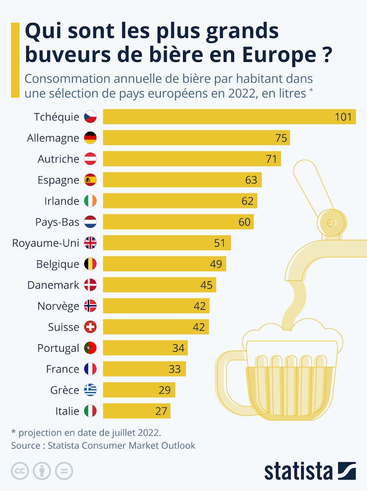 La France est aujourd’hui le 7e producteur de bière en Europe. Les Français en consomment en moyenne 33 litres par an, selon Statista. Même s’ils sont loin derrière les Tchèques et les Allemands avec respectivement 101 et 75 litres par an et par personne, c’est la seule boisson alcoolisée dont les ventes continuent d’augmenter, en particulier grâce à la production de bières artisanales. L’hexagone compte ainsi une dizaine de brasseries industrielles délivrant la majeure partie de la production de bière. Les deux principaux fabricants sont le Néerlandais Heineken et le danois Carlsberg, détenteur de la filiale française Kronenbourg. Cependant, les modes de consommation de bière des Français ont beaucoup changé ces dernières années, et le marché connaît une grande transformation.