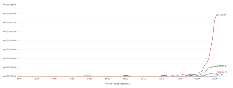 Les terroirs des « thés d’origine » sont presque toujours asiatiques, ce qui se traduit par des emprunts lexicaux au japonais et au chinois. Un simple coup d’œil à l’outil Google Ngram – application linguistique permettant d’observer l’évolution de la fréquence d’un ou de plusieurs mots ou groupes de mots – permet de constater une explosion récente de la fréquence du mot japonais umami dans les données francophones.