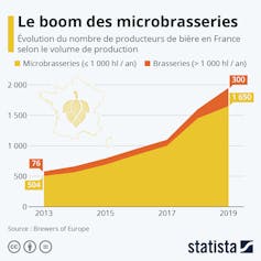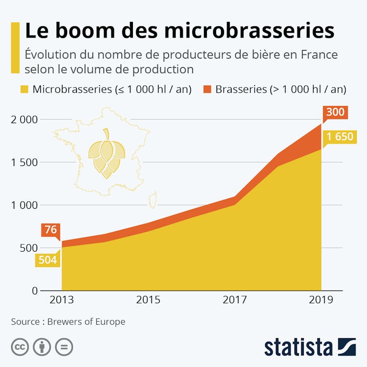 Pour autant, la France ne fait pas partie des grands producteurs de bière. En revanche, elle se distingue en Europe par la très forte croissance du nombre de brasseries artisanales. La production de bière y est ainsi très atomisée, à l’instar du vin. C’est d’ailleurs à rapprocher avec une autre caractéristique commune à ces trois grandes familles d’alcool : leurs productions maillent très finement le territoire français. Elles créent des emplois là il y en a parfois très peu, notamment dans les zones rurales, et pour tous les niveaux de qualifications, avec une prédominance marquée pour des emplois d’ouvrier. C’est sans doute l’un des principaux intérêts économiques de ces filières.